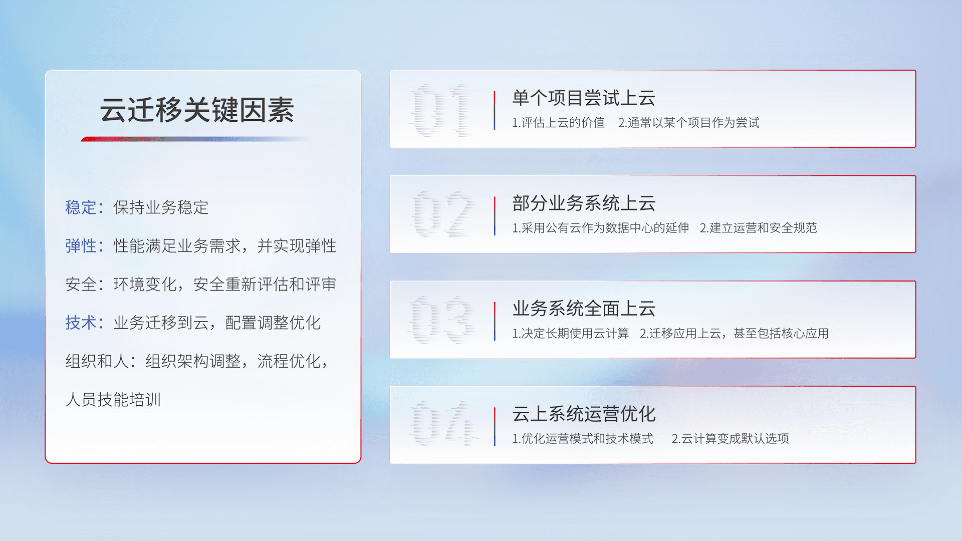 结合实际业务,,,,从规划设计、、、、云平台选型、、、云原生改造、、、、数据迁移、、集成交付,,,迁移全过程为客户识别最佳上云路径,,,,做好风险识别管理,,,,设计网络架构、、、身份权限、、、、安全审计合规、、、、操作审计、、、日志审计、、监控告警策略、、多站点容灾设计等,,,对云上基础设施进行整体规划,,,提升IT治理水平,,以满足弹性、、、、高可用、、高性能的需求。。