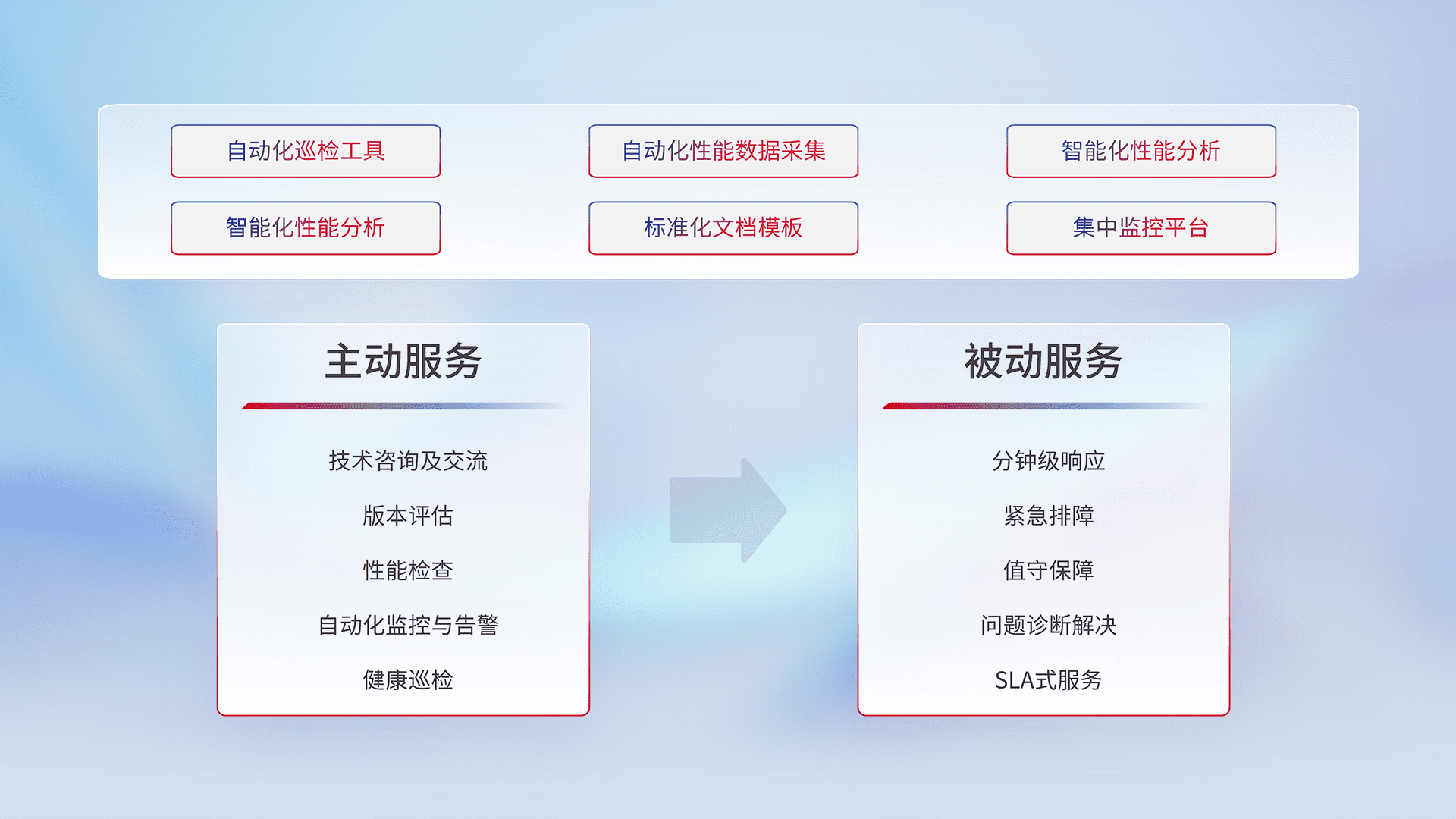 智能化工具和标准化文档,,,,保障服务质量,,,提供主动服务(包含技术咨询、、、版本评估、、、、性能检查、、、自动化监控与告警、、、、健康巡检)和被动服务包含(分钟级响应、、紧急排障、、、、值守保障、、、、问题诊断解决、、SLA服务)。。