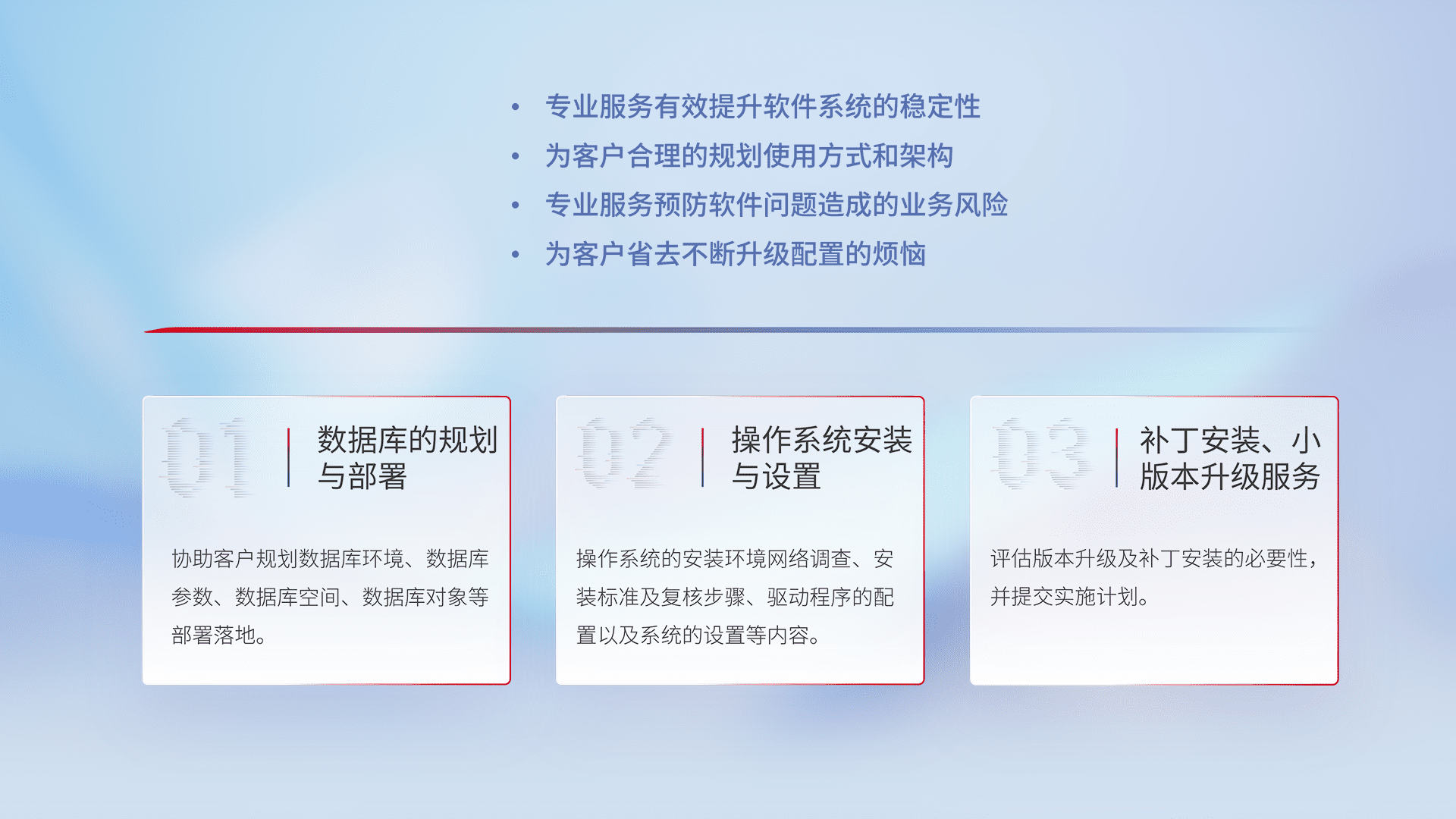 为客户提供软件规模升级、、、、快速部署、、按需配置的专业服务,,,从数据库的规划与部署到操作系统的安装与设置,,,,再到补丁安装和小版本升级提供支持。。。
